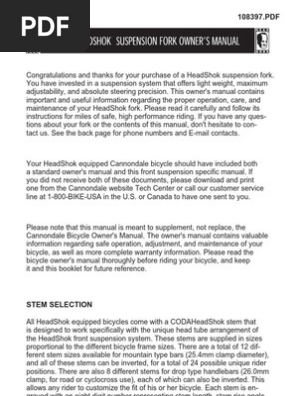 Ernie through the bottom clamp into the head tube and out the upper clamp. This manual is intended to be used as a resource for our dealers helping them to service the ever expanding range of cannondale headshok and coda. This means we re also authorised to carry out warranty work for cannondale lefty and headshok and we carry a massive range. When installing disc brakes to a lefty fork please consult the disc brake fitting instruc tions that are included with the brakes.